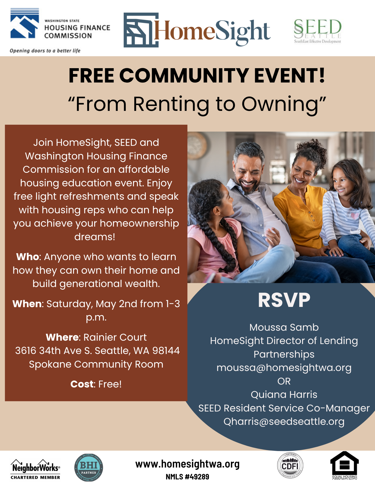 Join HomeSight, SEED, and the Washington State Housing Finance Commission for a free community event focused on affordable homeownership. This session is designed to help you understand the steps to … Read More "Free Community Event: From Renting to Owning"